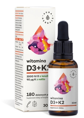 Aura Herbals Witamina D3 2000 IU + K2 MK-7 to suplement diety w wygodnej formie kropli, zawierający połączenie witaminy D3 oraz witaminy K2 MK-7. Preparat oparty jest na oliwie z oliwek, co sprzyja łatwemu spożyciu i stabilności składników. Produkt przeznaczony jest do codziennego uzupełniania diety osób dorosłych w witaminę D oraz K.