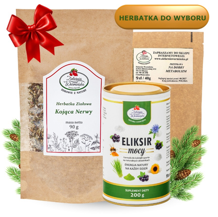 - W skład zestawu wchodzi wybrana herbatka ziołowa o wartości 37 zł, przyprawa o wartości 9 zł, Eliksir Mocy o wartości 119 zł oraz czerwone pudełko prezentowe o wartości 7 zł. Łączna wartość elementów kupowanych osobno wynosi 172 zł.