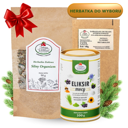 - W skład zestawu wchodzi wybrana herbatka ziołowa o wartości 37 zł, przyprawa o wartości 9 zł, Eliksir Mocy o wartości 119 zł oraz czerwone pudełko prezentowe o wartości 7 zł. Łączna wartość elementów kupowanych osobno wynosi 172 zł.
