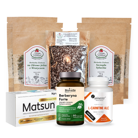 Zestaw ,,Odchudzanie i oczyszczanie 2 w 1 TURBO PLUS'' to intensywne, naturalne wsparcie codziennej diety, stworzone z myślą o osobach dbających o jelita, trawienie i wewnętrzną równowagę organizmu. Starannie dobrane herbatki ziołowe, błonnik, probiotyk oraz berberyna z chromem tworzą kompleks, który może stanowić element codziennej troski o metabolizm, lekkość i dobre samopoczucie. Zestaw ułatwia urozmaicenie diety o tradycyjne składniki roślinne, błonnik pokarmowy oraz suplement diety oparty na berberynie – alkaloidzie znanym i stosowanym od wieków w zielarstwie.
