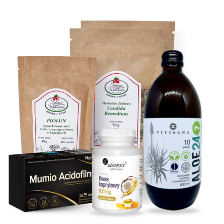 Zestaw „Wsparcie na Candida Balans” to starannie dobrane połączenie herbatek ziołowych, kapsułek roślinnych i soku aloesowego oraz suplementów diety, które mogą wspierać codzienną troskę o prawidłowe funkcjonowanie układu pokarmowego i równowagę mikroflory jelitowej. Zawarte w nim produkty tradycyjnie stosowane są w diecie wspierającej naturalne procesy trawienne, odporność i ogólne samopoczucie.