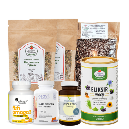 Zestaw ,,WSPARCIE WĄTROBY EXTRA" zawiera 7 produktów: